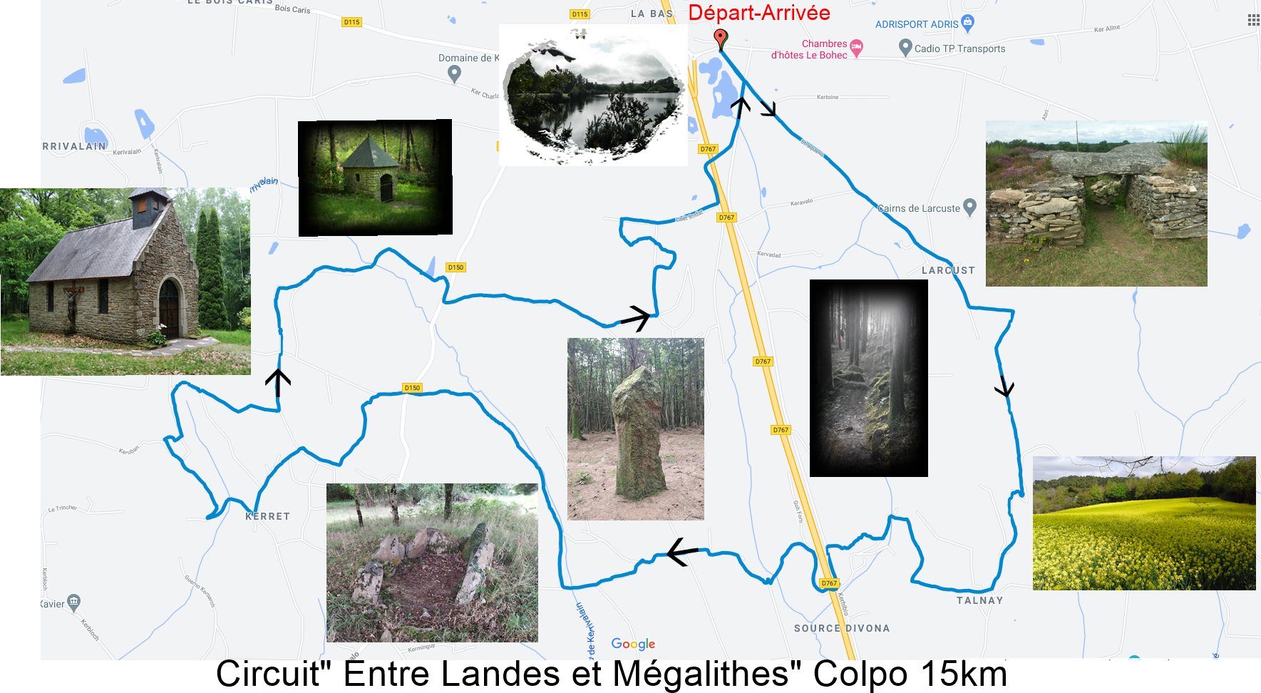 Le nouveau circuit « Entre Landes et Mégalithes » vient d’être validé. Sur une distance mesurée de 15km, ce circuit permettra aux marcheurs et coureurs de découvrir des paysages variés sur la commune de Colpo et alentours. Le parcours composé majoritairement de chemins vous fera découvrir(entre autres) les sites mégalithiques de Larcuste, de Lost er Lenn, le village de Kerret, la chapelle et la fontaine du Cloître haut lieu de la Résistance, etc. Le parcours se fait dans le sens des aiguilles d’une montre.